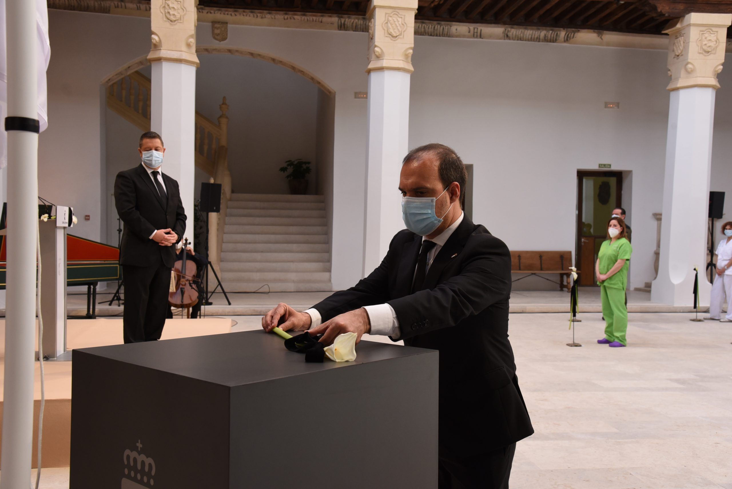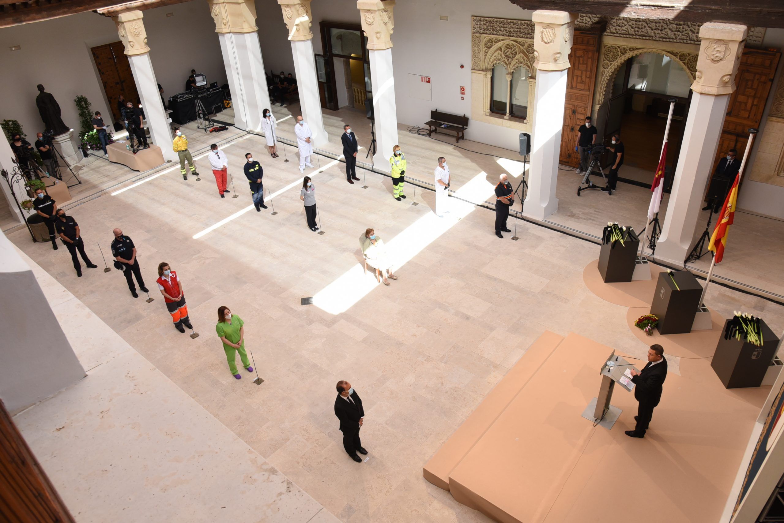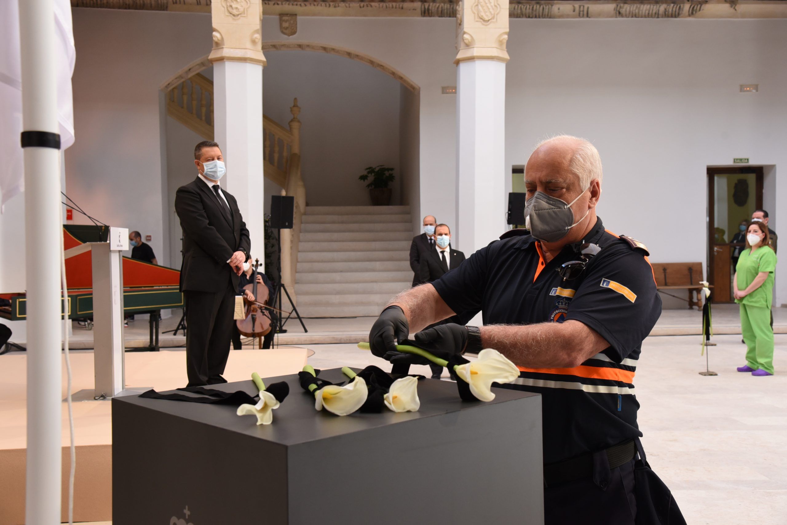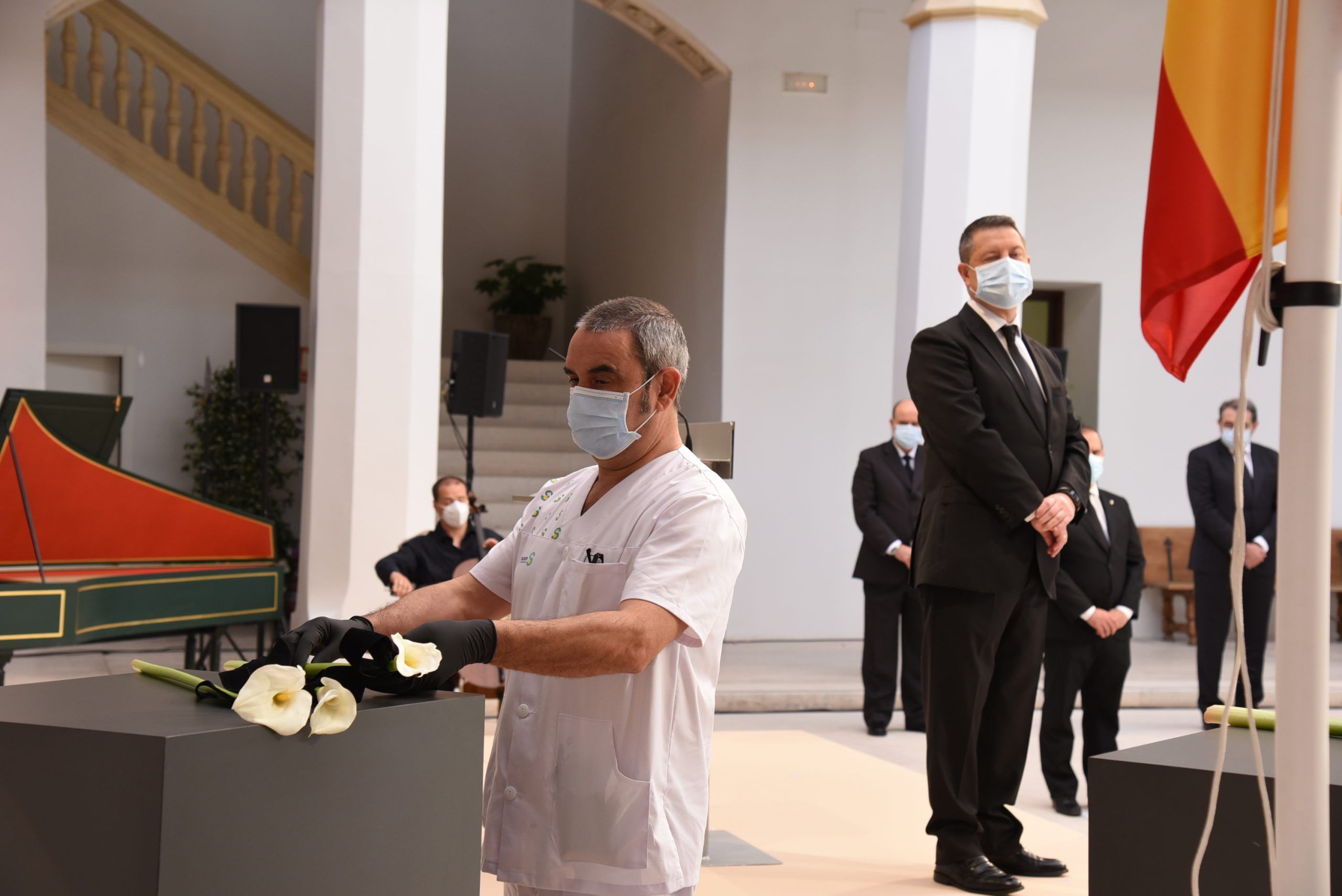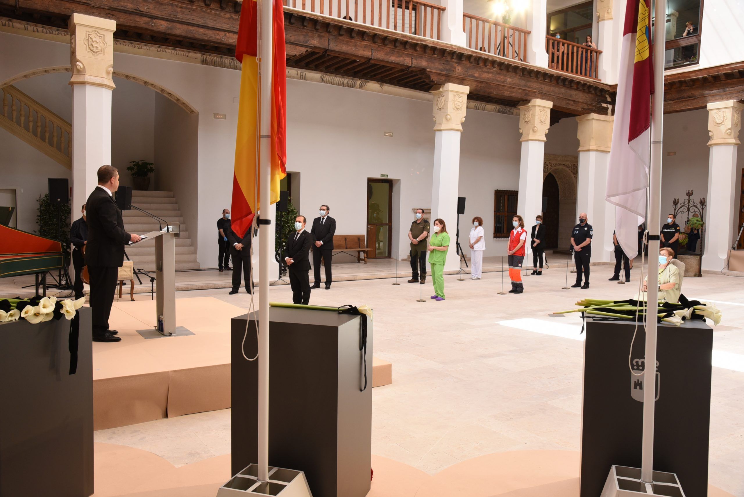 “Gratitud, coraje, unidad y futuro” han sido las palabras de García-Page ante apenas 30 invitados, hoy protagonistas en el patio del Palacio de Fuensalida, sede de la Presidencia del Gobierno regional. Un acto atípico para esta jornada que ha estado marcado por las banderas a media asta, un puñado de calas blancas enfundadas en un lazo negro y otro ramo de rosas rojas y amarillas simulando la bandera de España. Precisamente la bandera de España ha sido portada por un enfermero al ser este el “año de la Enfermería y la Matrona”.