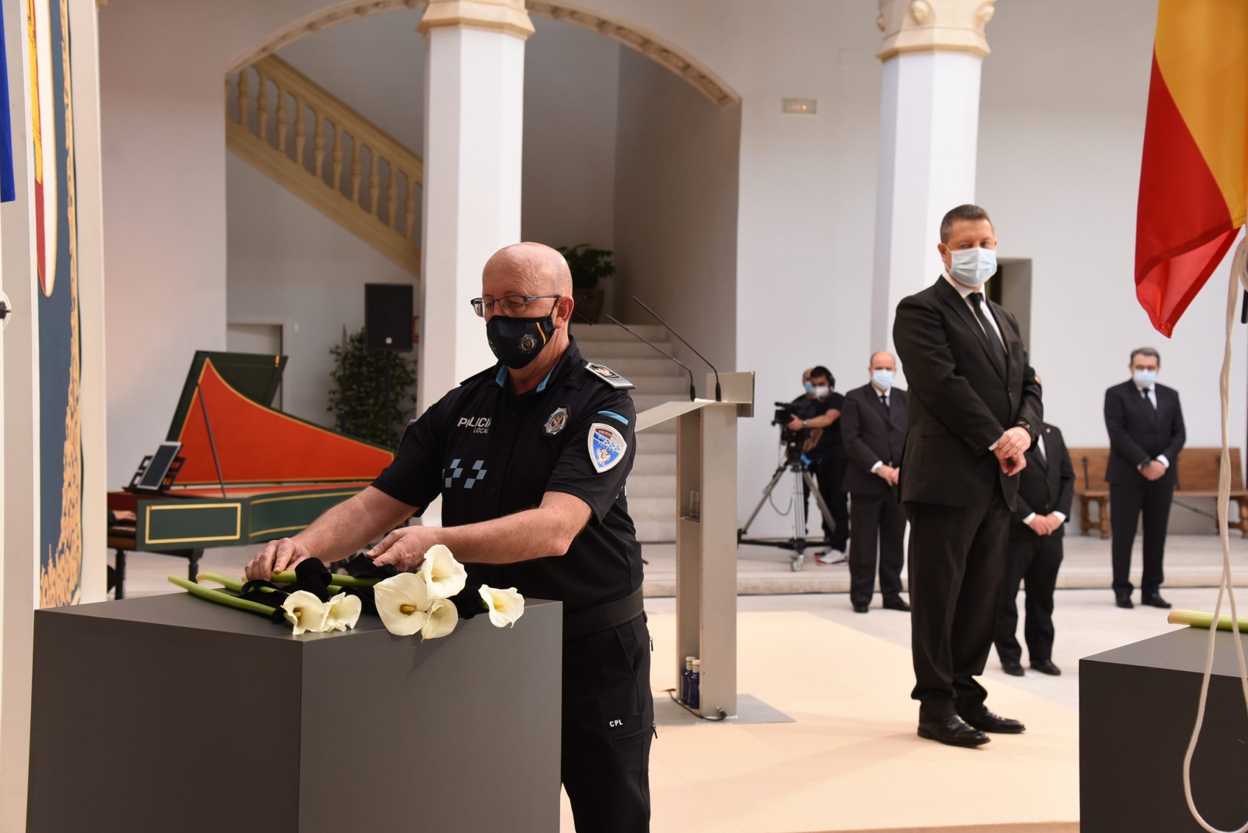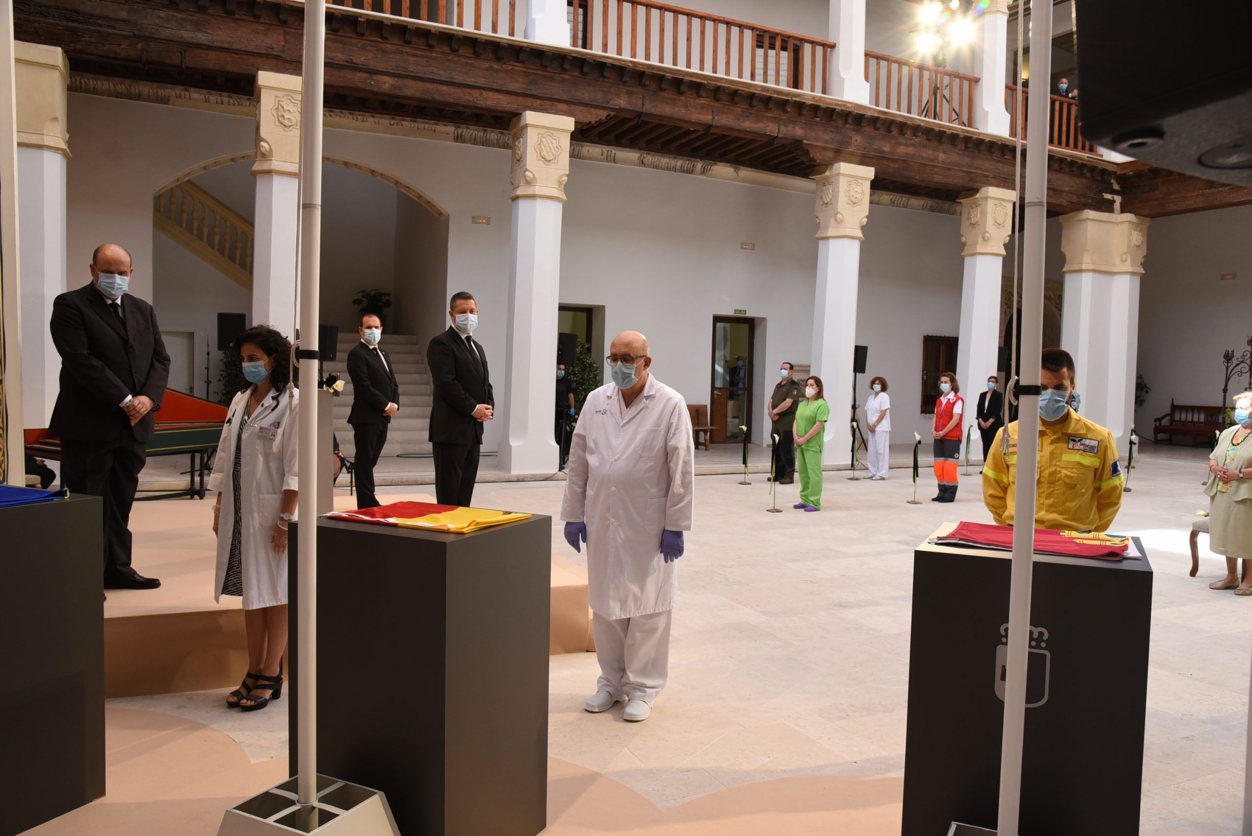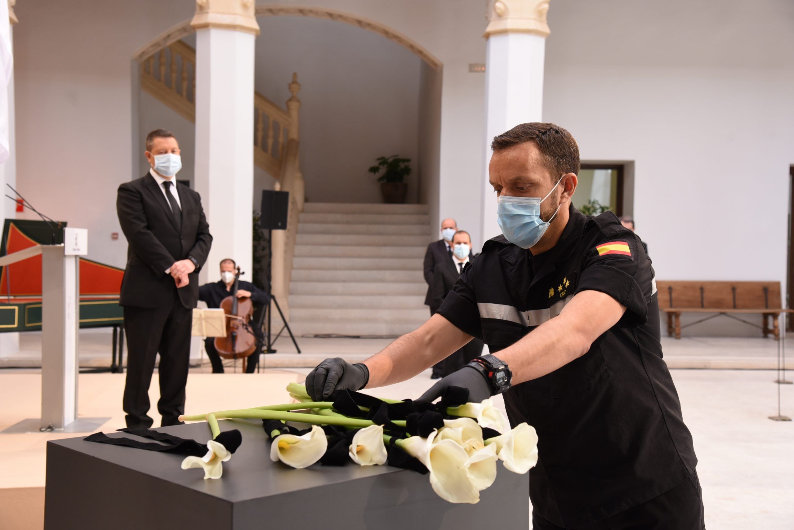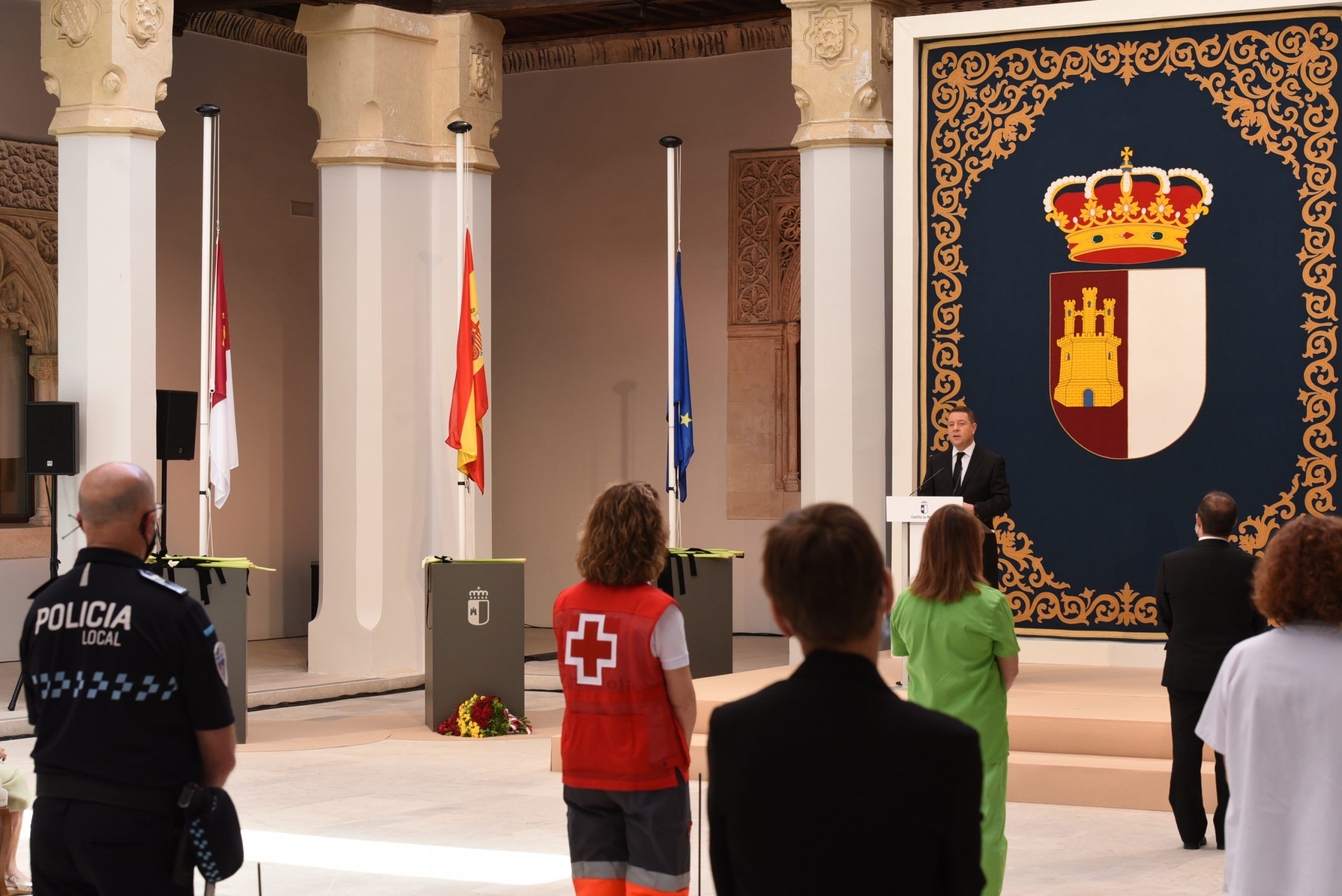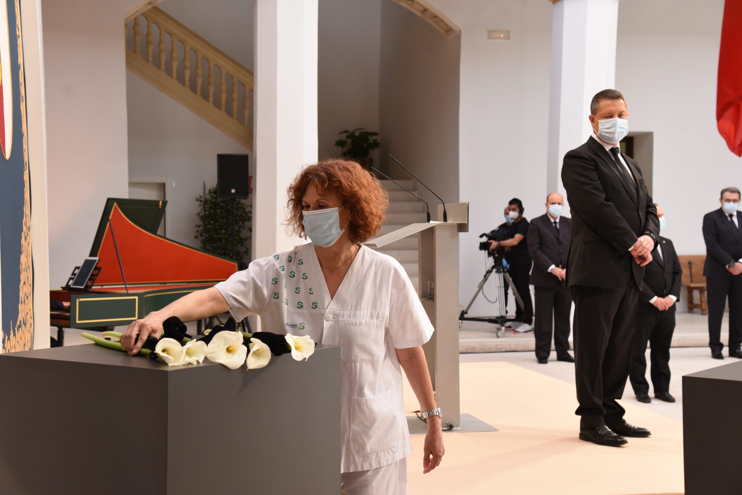 “Gratitud, coraje, unidad y futuro” han sido las palabras de García-Page ante apenas 30 invitados, hoy protagonistas en el patio del Palacio de Fuensalida, sede de la Presidencia del Gobierno regional. Un acto atípico para esta jornada que ha estado marcado por las banderas a media asta, un puñado de calas blancas enfundadas en un lazo negro y otro ramo de rosas rojas y amarillas simulando la bandera de España. Precisamente la bandera de España ha sido portada por un enfermero al ser este el “año de la Enfermería y la Matrona”.