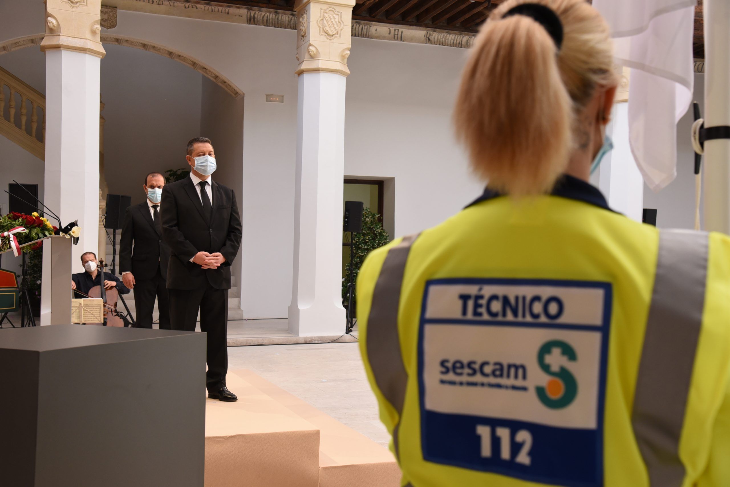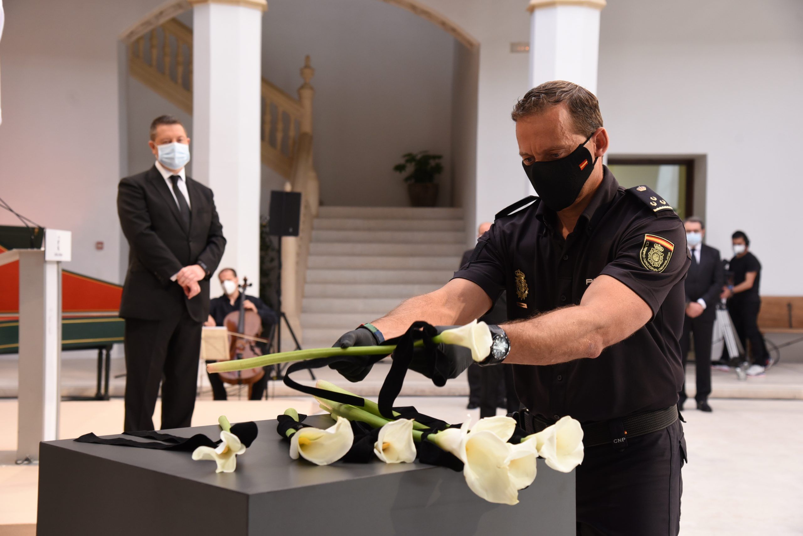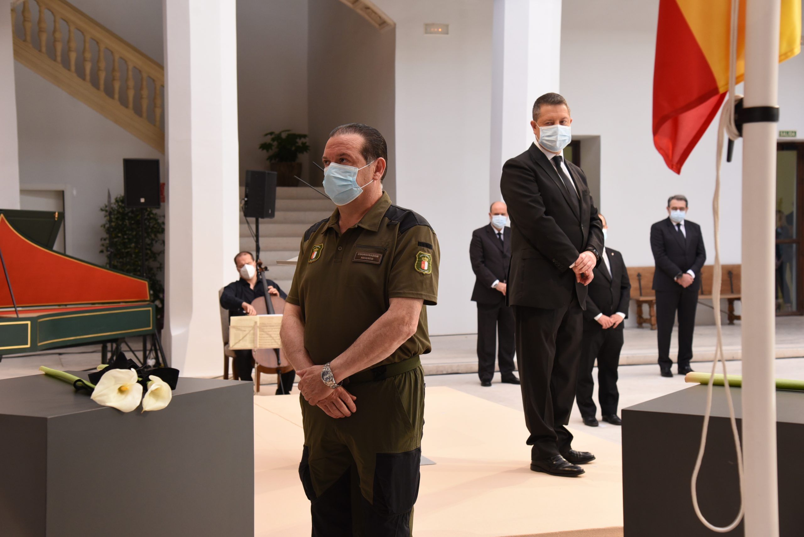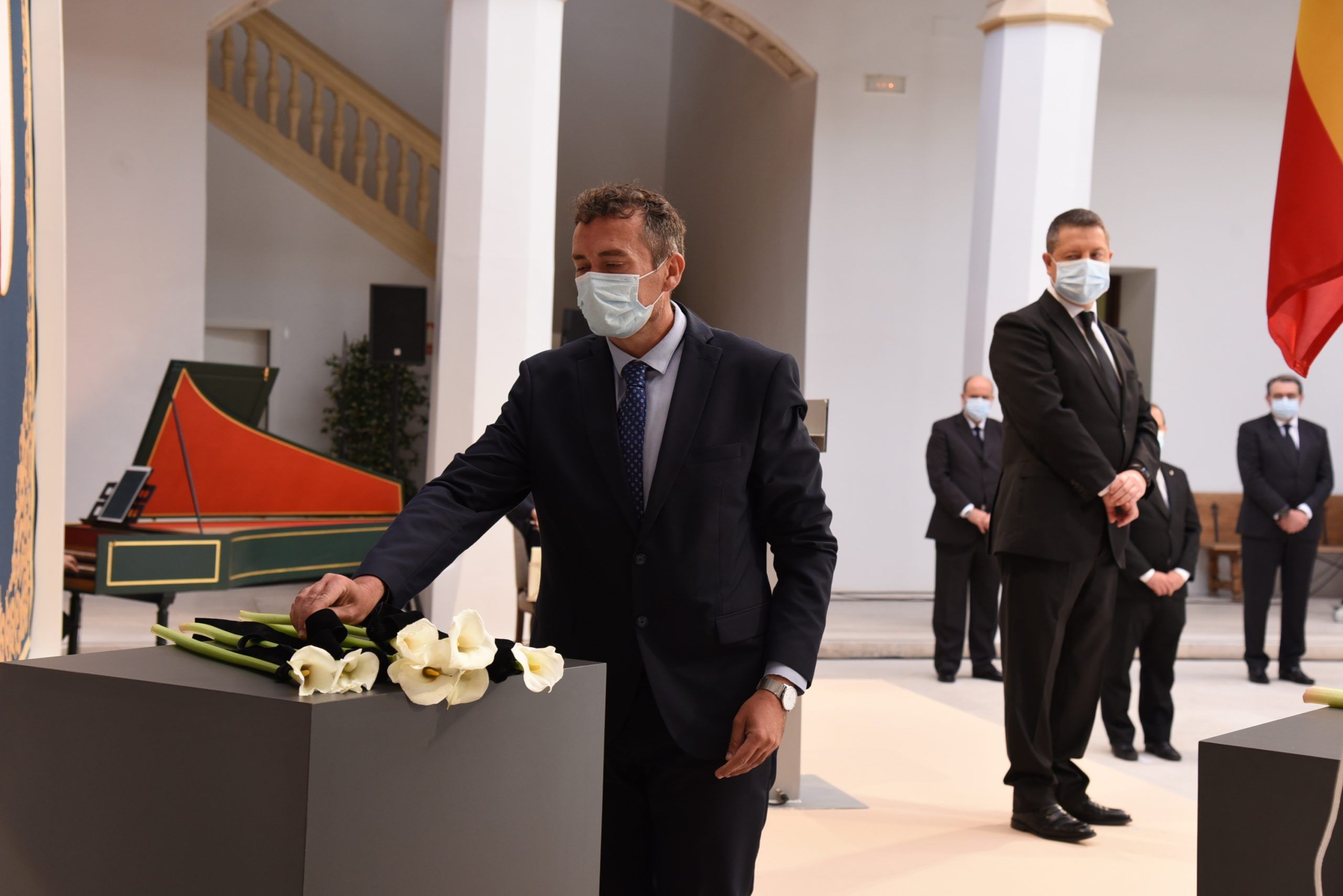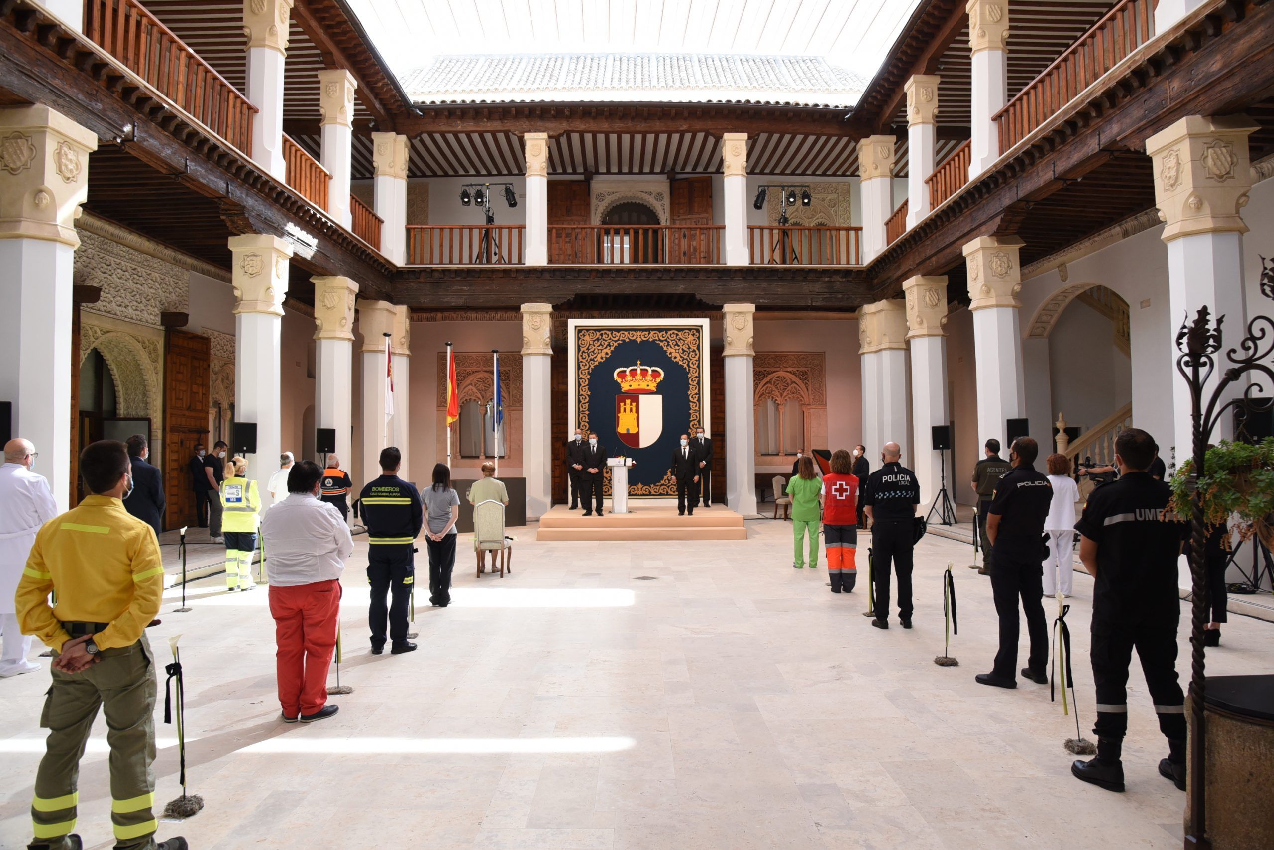 “Gratitud, coraje, unidad y futuro” han sido las palabras de García-Page ante apenas 30 invitados, hoy protagonistas en el patio del Palacio de Fuensalida, sede de la Presidencia del Gobierno regional. Un acto atípico para esta jornada que ha estado marcado por las banderas a media asta, un puñado de calas blancas enfundadas en un lazo negro y otro ramo de rosas rojas y amarillas simulando la bandera de España. Precisamente la bandera de España ha sido portada por un enfermero al ser este el “año de la Enfermería y la Matrona”.