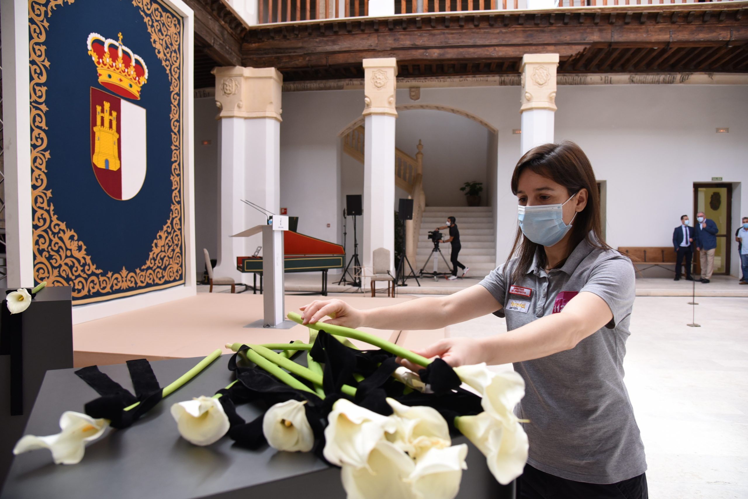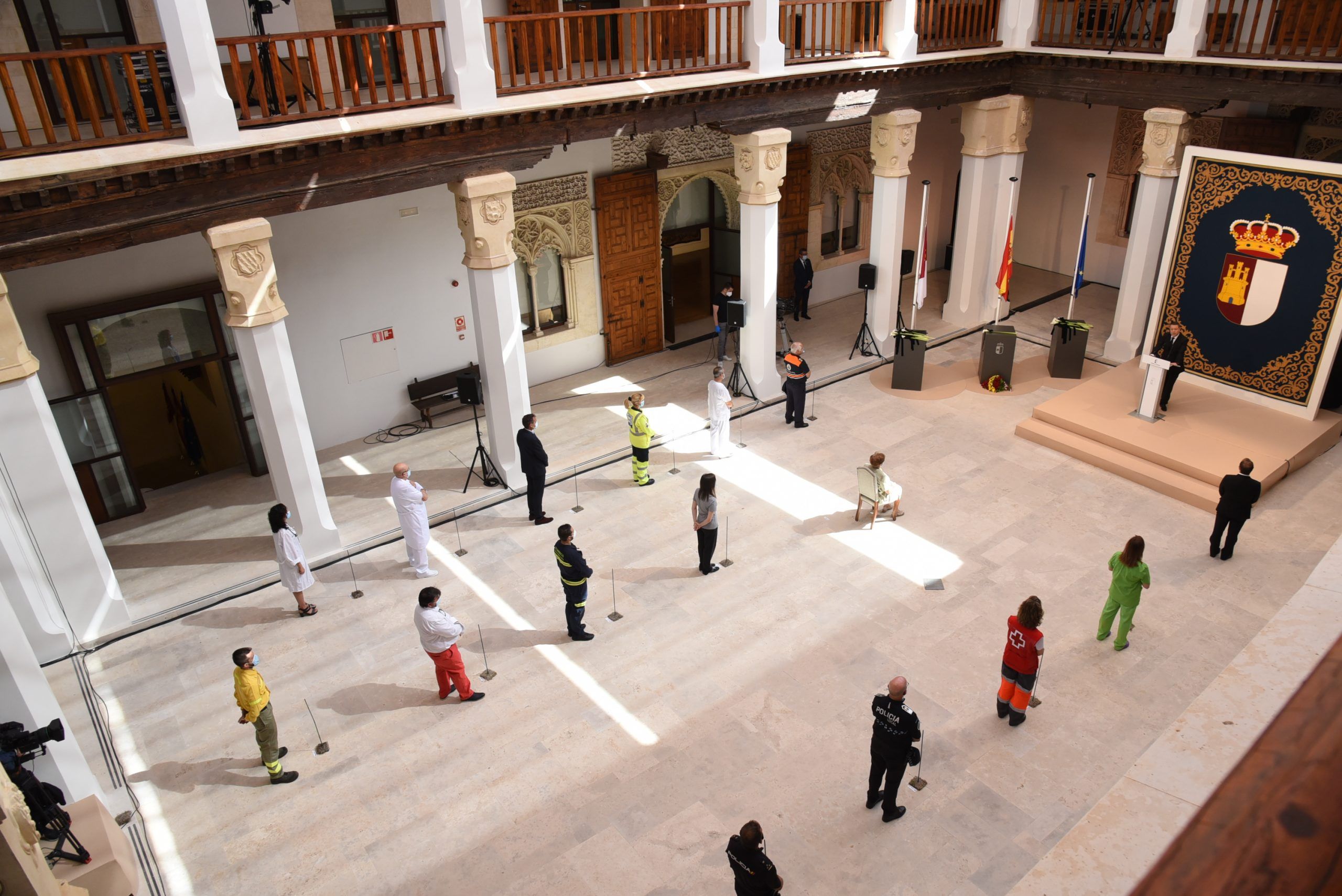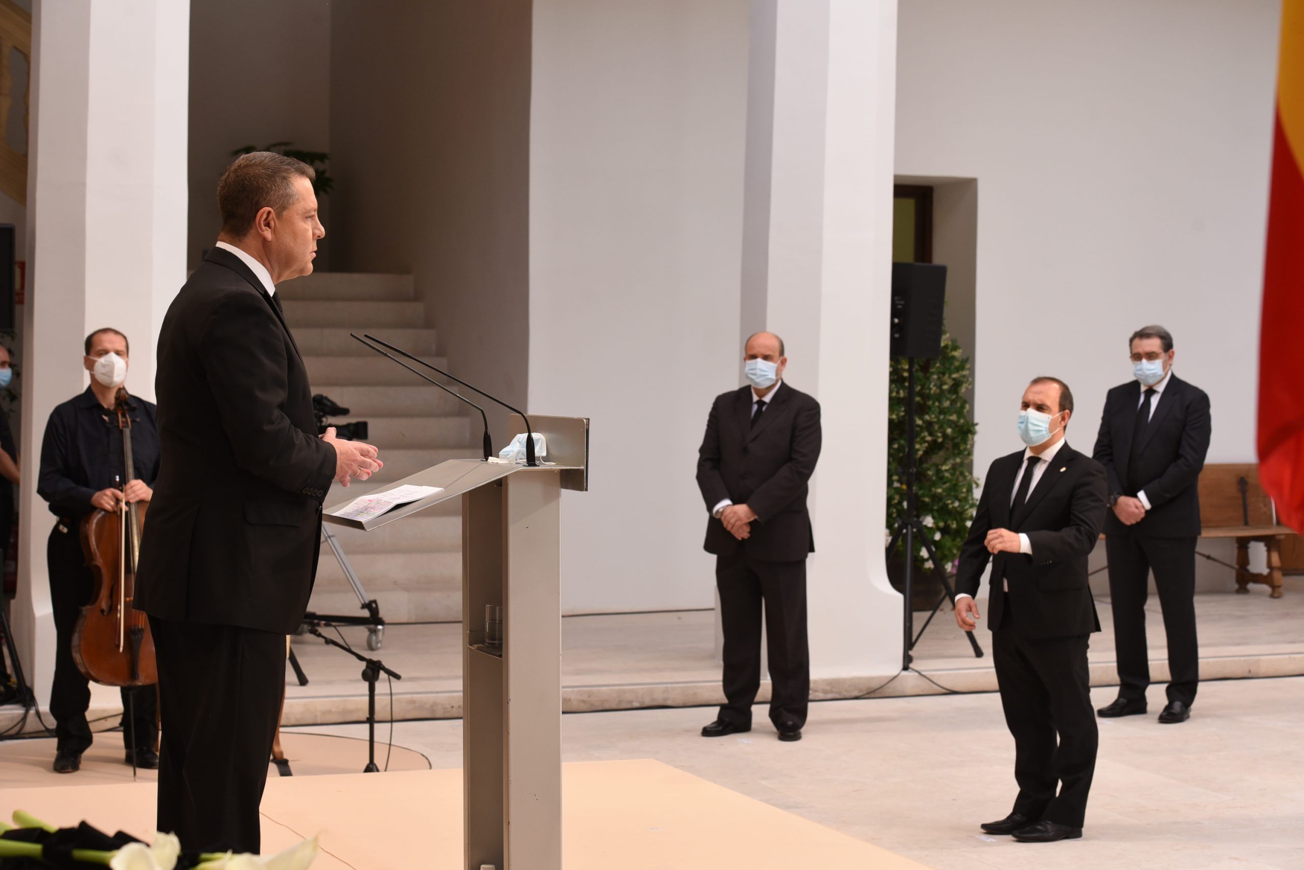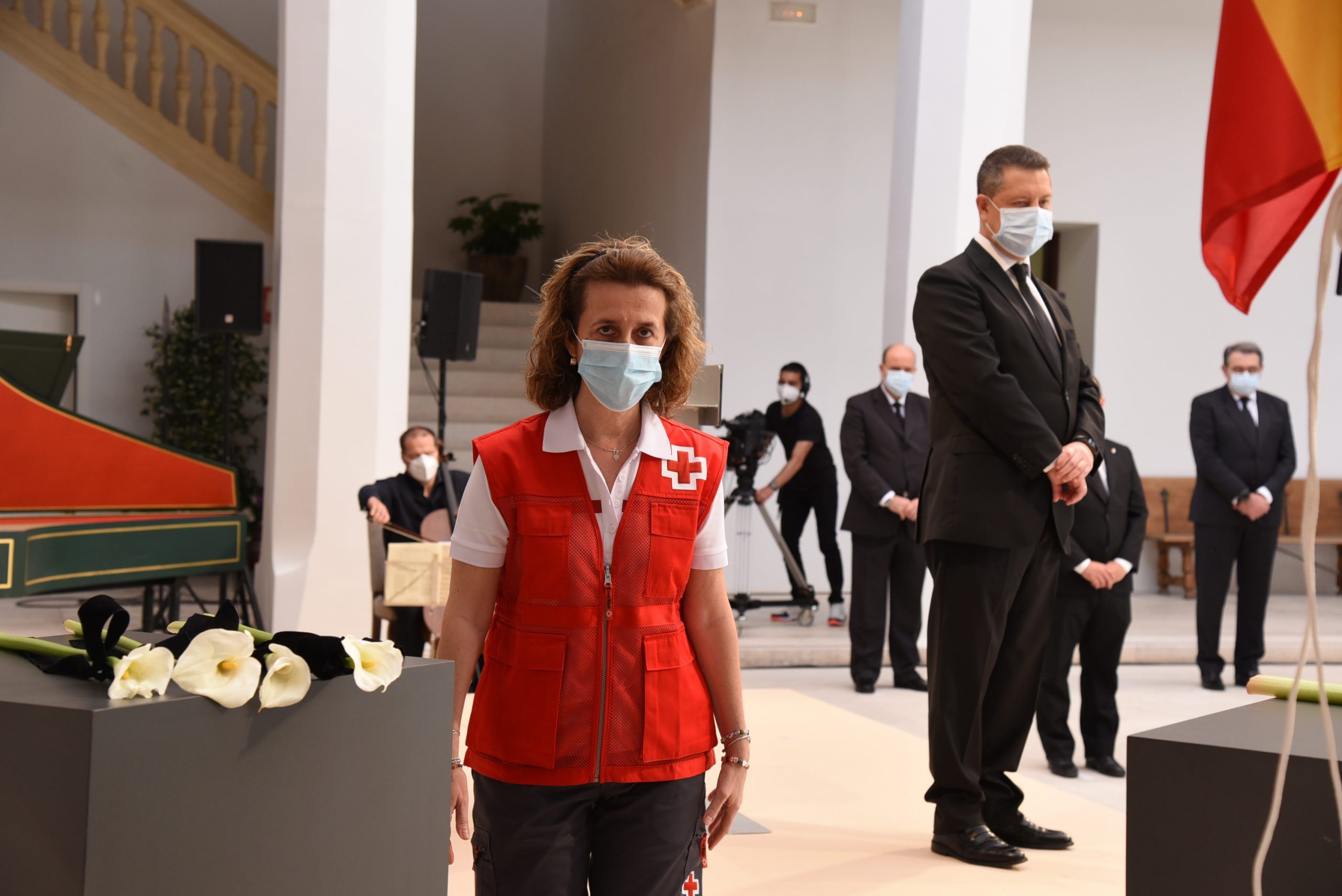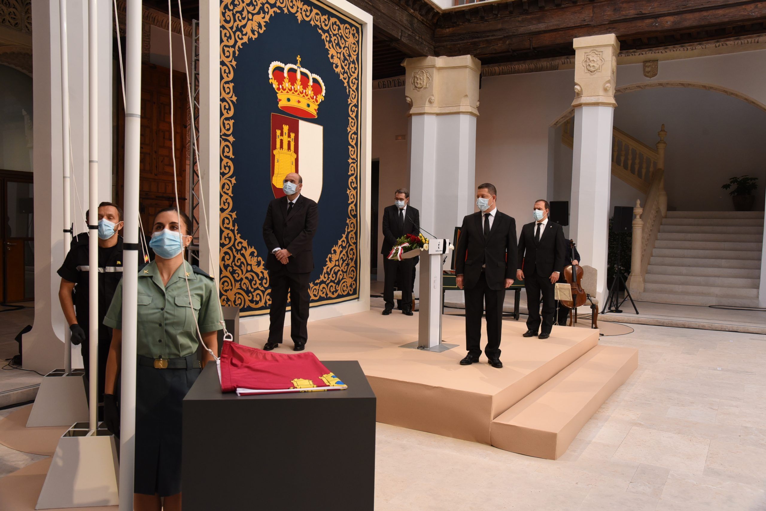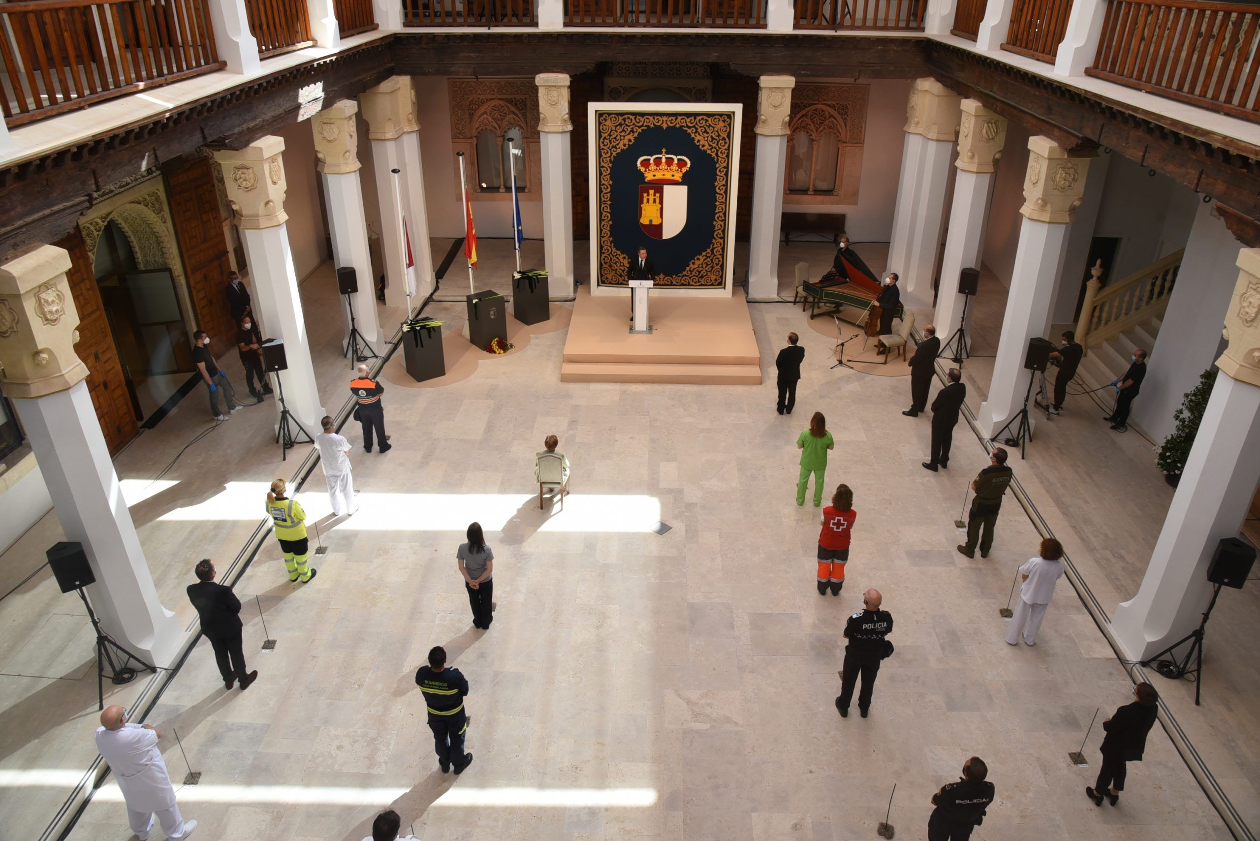 “Gratitud, coraje, unidad y futuro” han sido las palabras de García-Page ante apenas 30 invitados, hoy protagonistas en el patio del Palacio de Fuensalida, sede de la Presidencia del Gobierno regional. Un acto atípico para esta jornada que ha estado marcado por las banderas a media asta, un puñado de calas blancas enfundadas en un lazo negro y otro ramo de rosas rojas y amarillas simulando la bandera de España. Precisamente la bandera de España ha sido portada por un enfermero al ser este el “año de la Enfermería y la Matrona”.