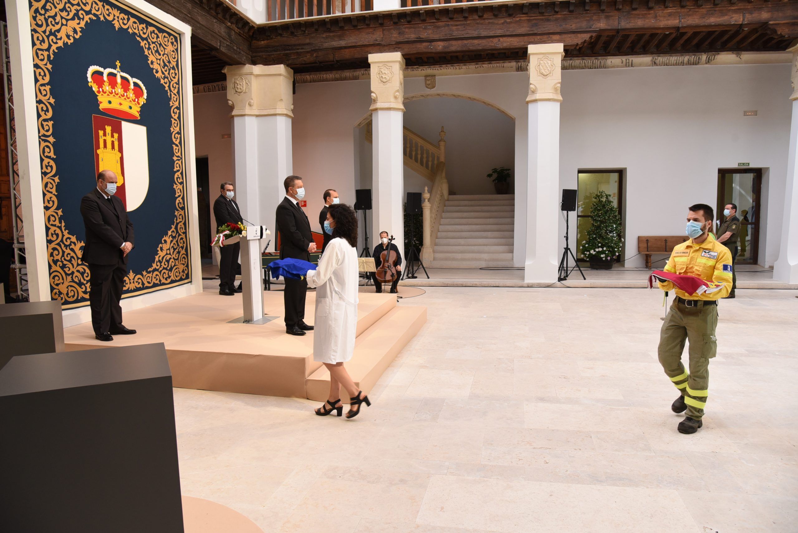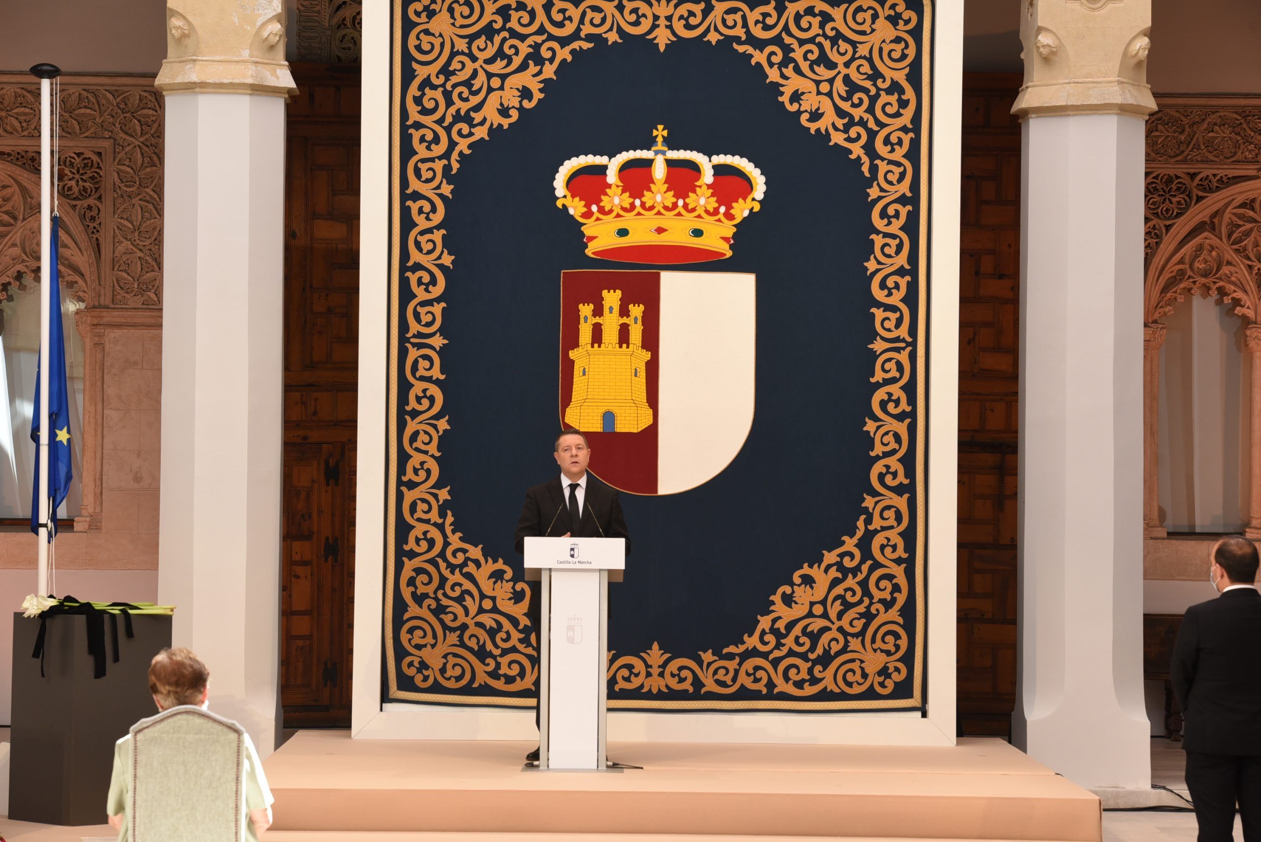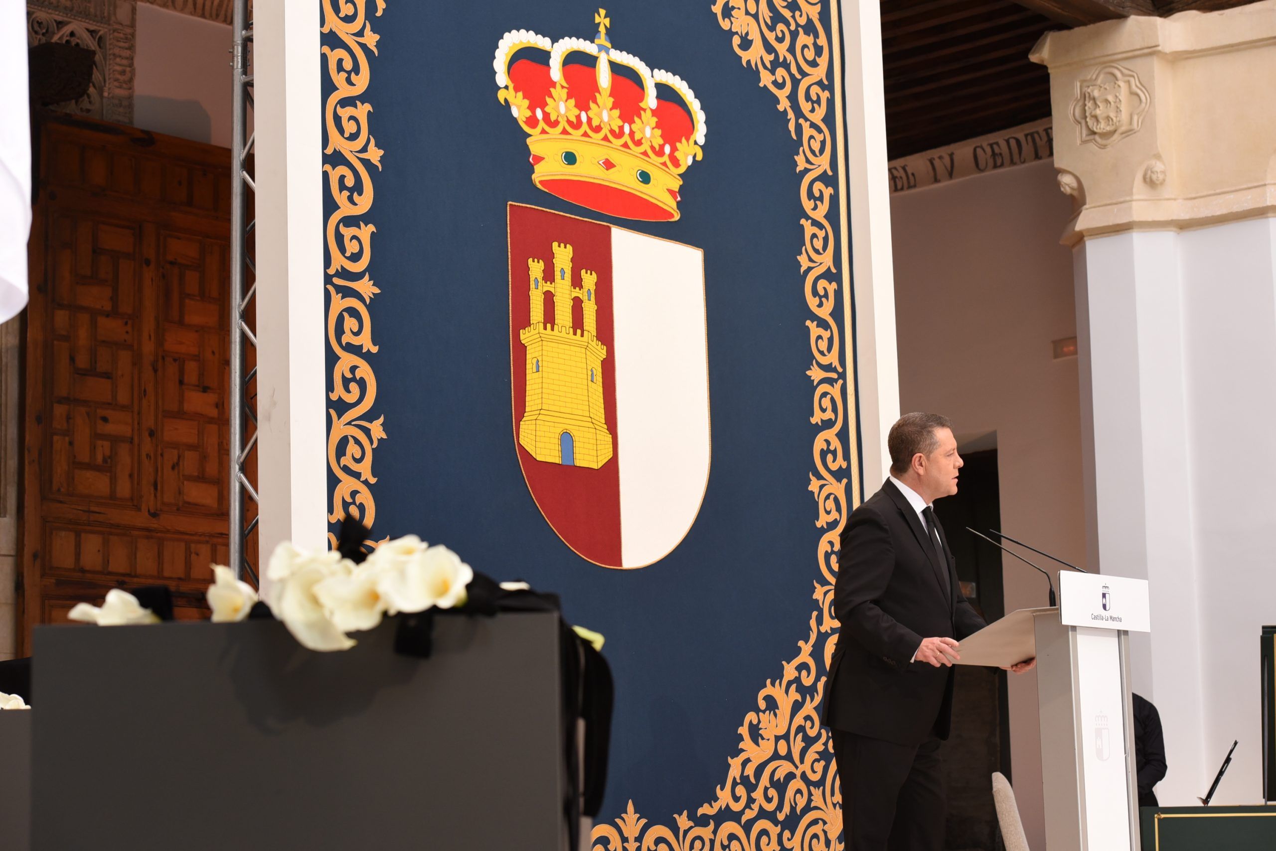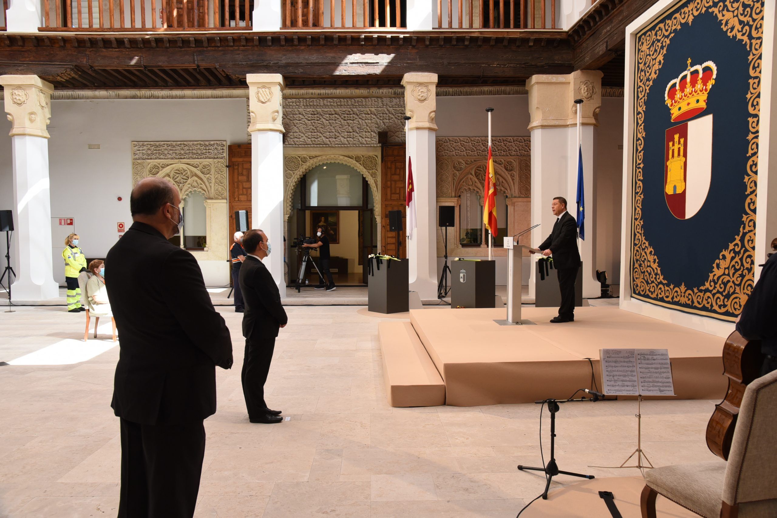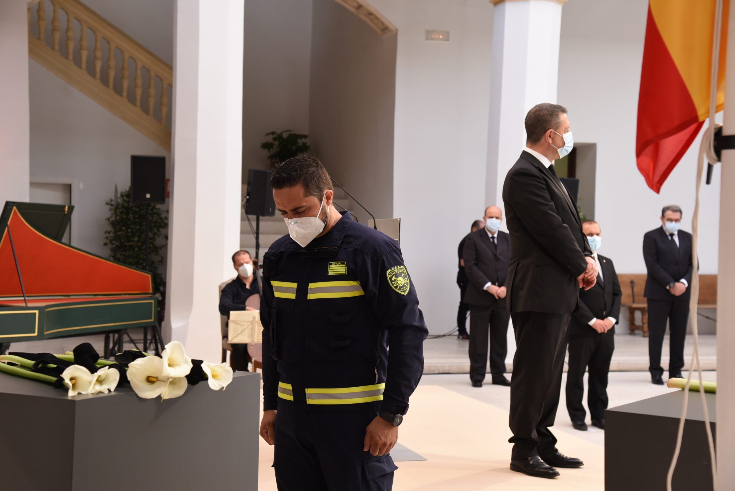 “Gratitud, coraje, unidad y futuro” han sido las palabras de García-Page ante apenas 30 invitados, hoy protagonistas en el patio del Palacio de Fuensalida, sede de la Presidencia del Gobierno regional. Un acto atípico para esta jornada que ha estado marcado por las banderas a media asta, un puñado de calas blancas enfundadas en un lazo negro y otro ramo de rosas rojas y amarillas simulando la bandera de España. Precisamente la bandera de España ha sido portada por un enfermero al ser este el “año de la Enfermería y la Matrona”.