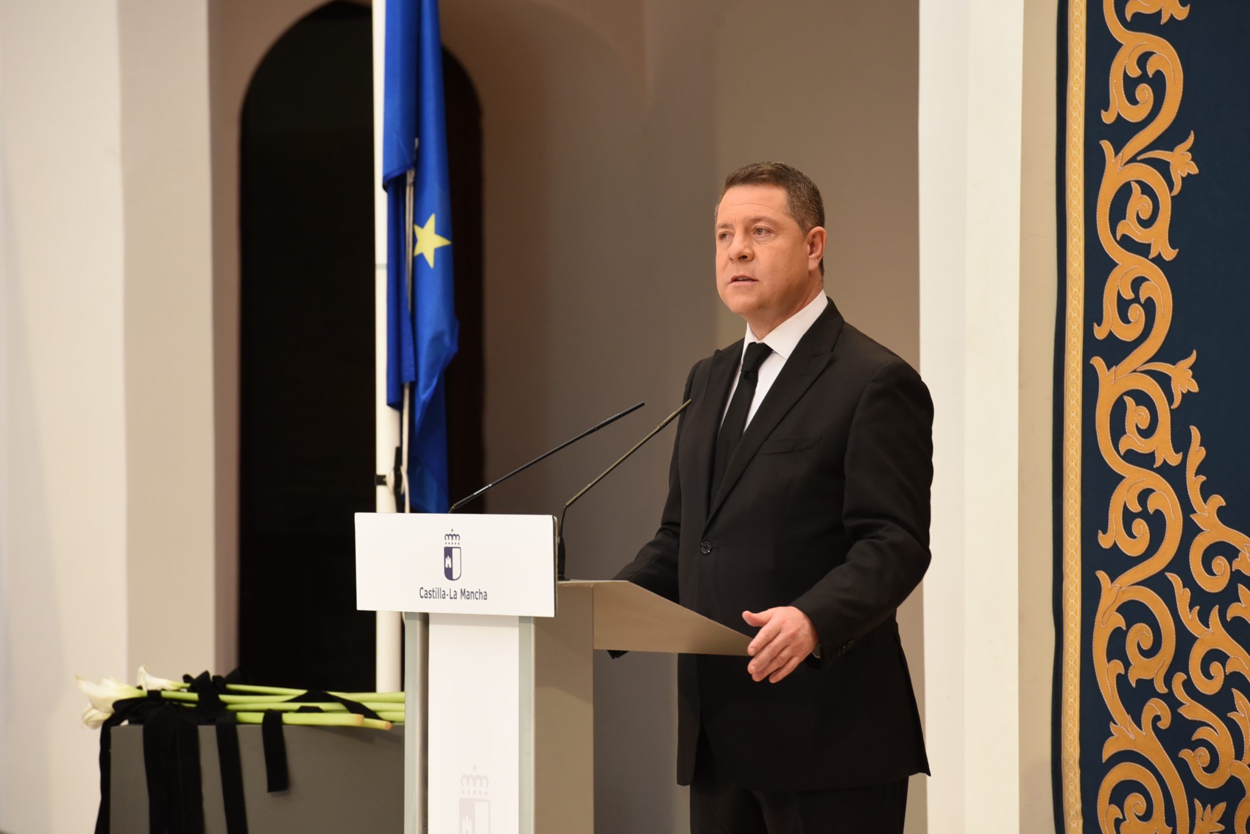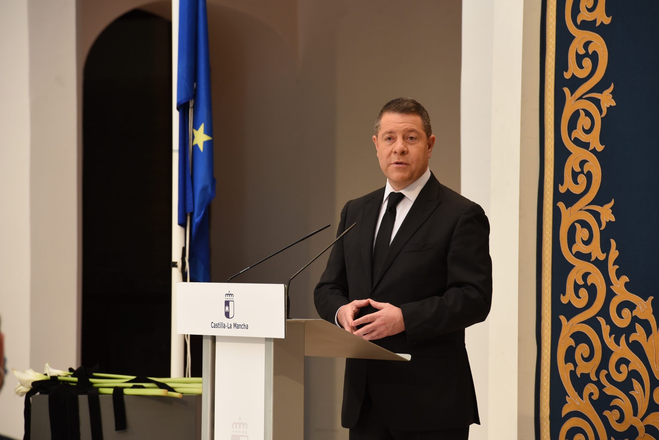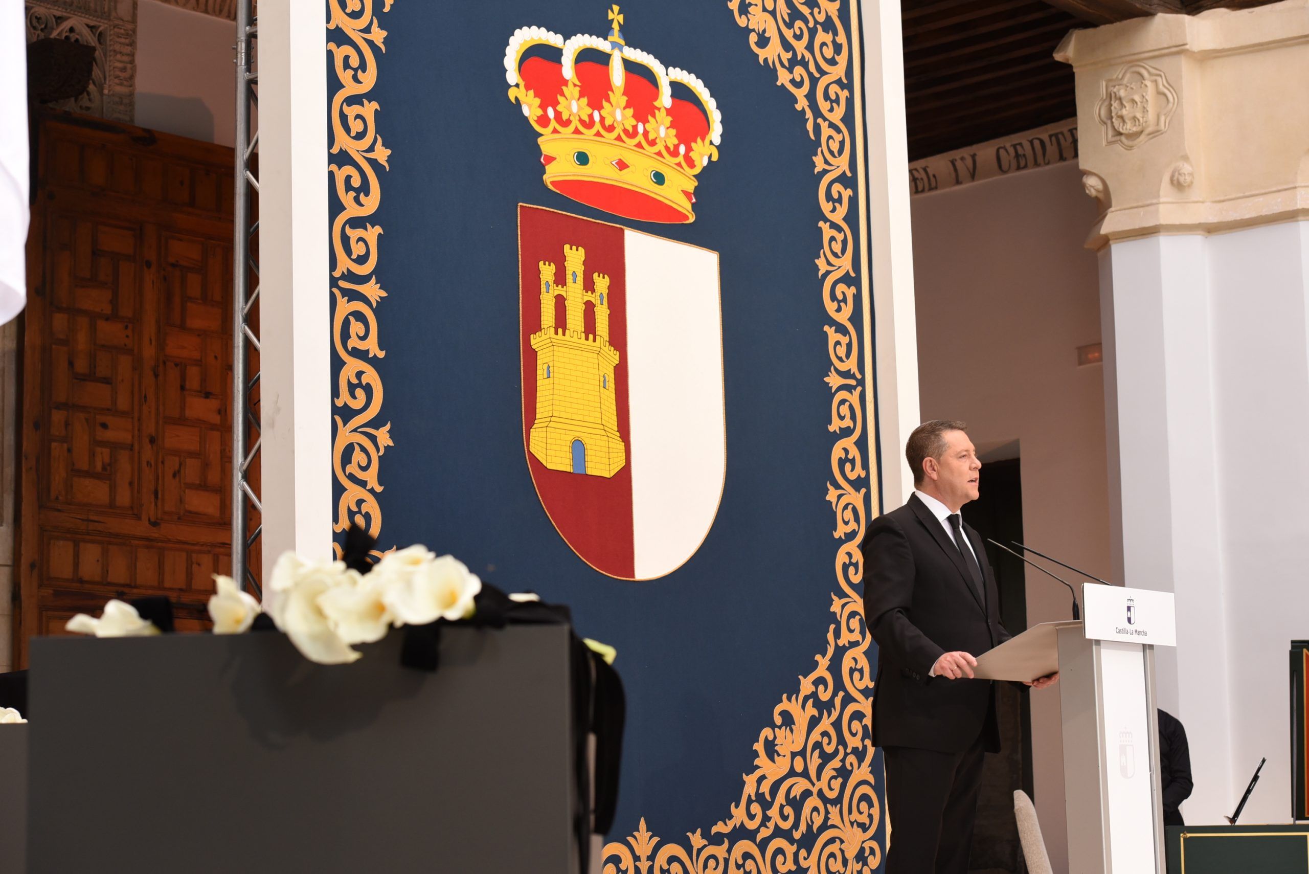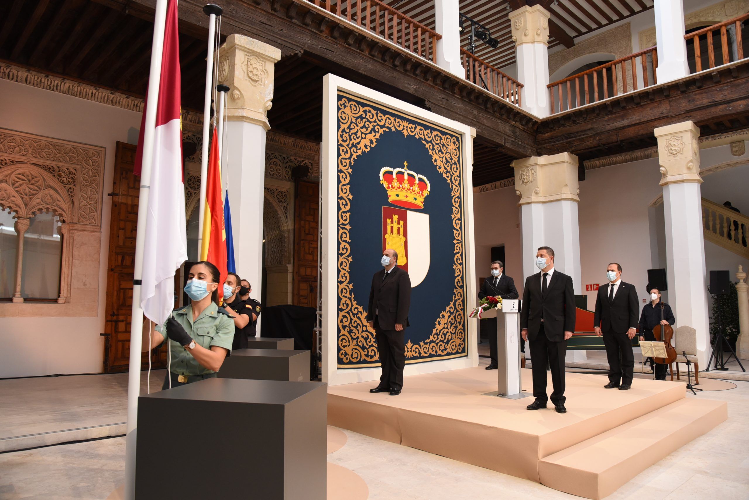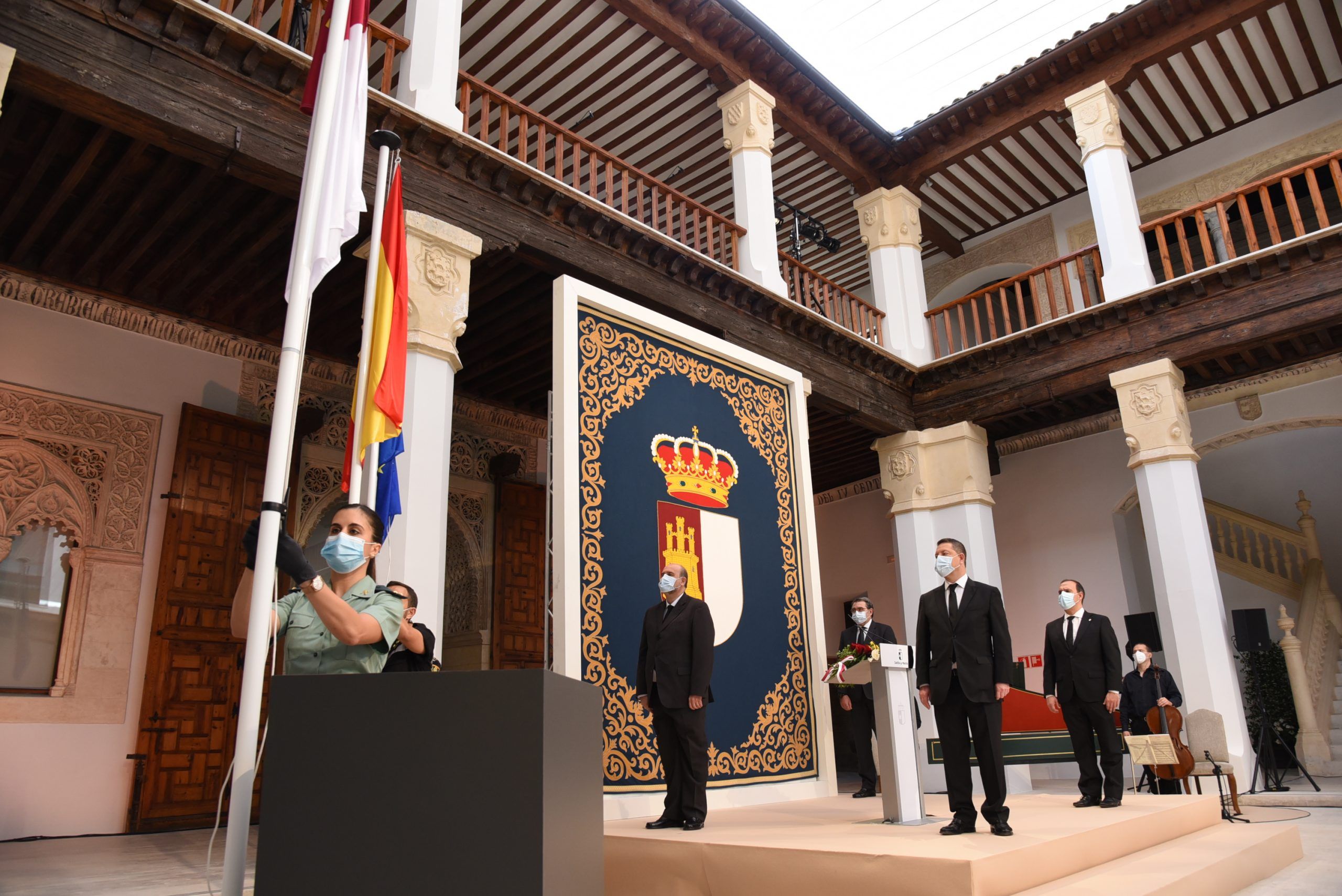 “Gratitud, coraje, unidad y futuro” han sido las palabras de García-Page ante apenas 30 invitados, hoy protagonistas en el patio del Palacio de Fuensalida, sede de la Presidencia del Gobierno regional. Un acto atípico para esta jornada que ha estado marcado por las banderas a media asta, un puñado de calas blancas enfundadas en un lazo negro y otro ramo de rosas rojas y amarillas simulando la bandera de España. Precisamente la bandera de España ha sido portada por un enfermero al ser este el “año de la Enfermería y la Matrona”.