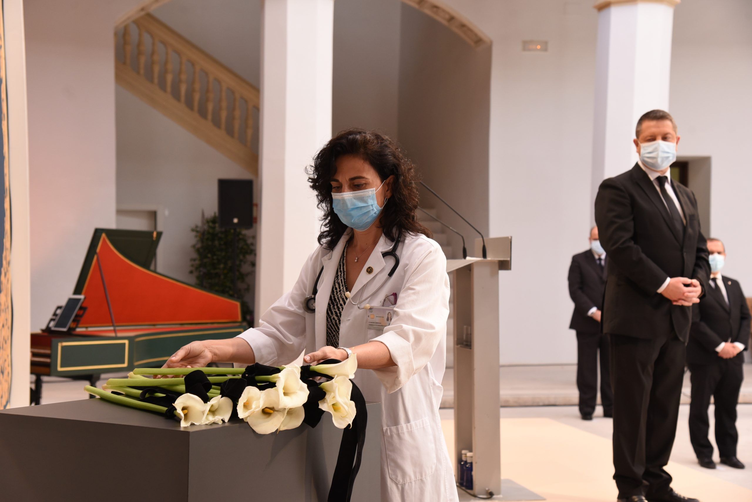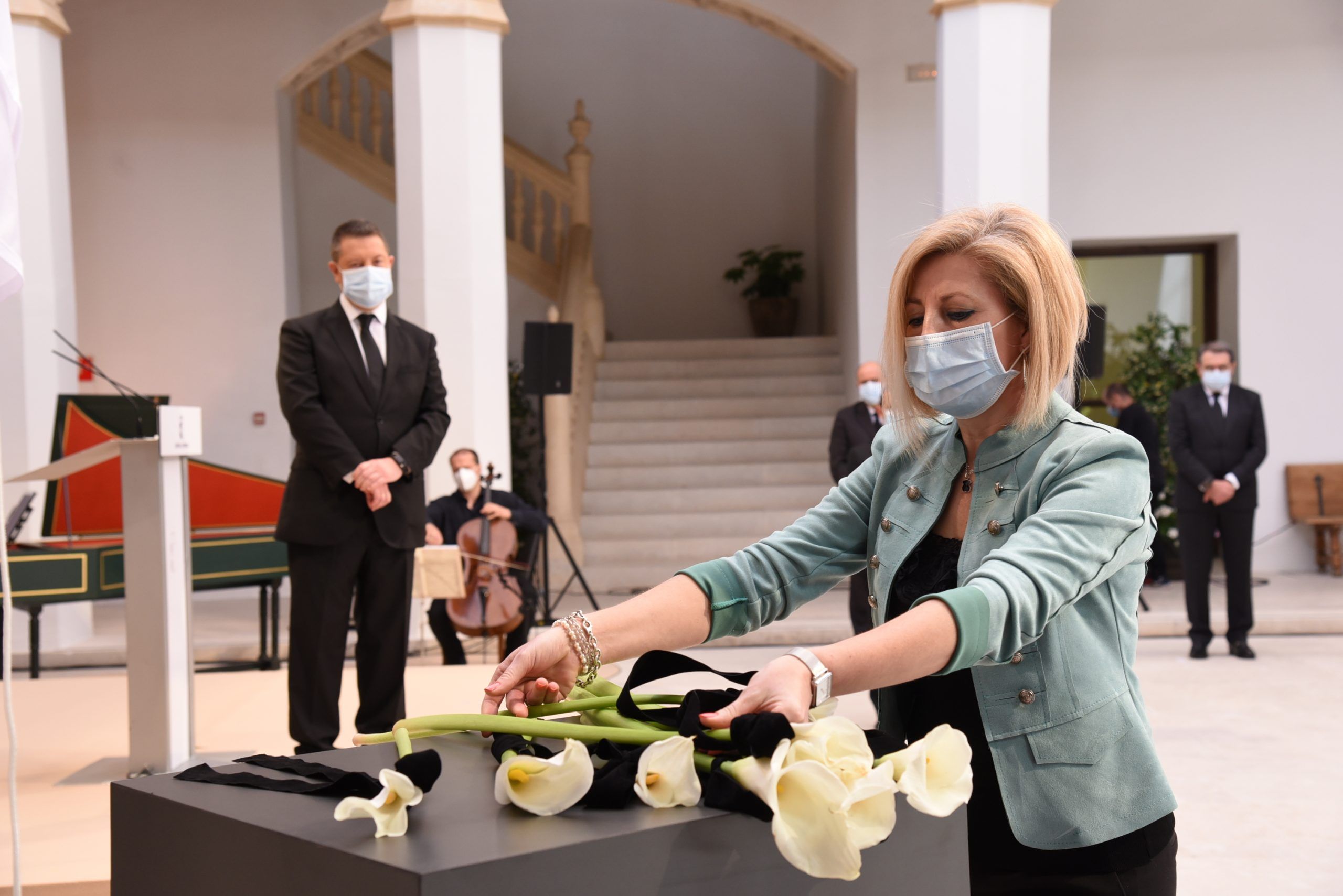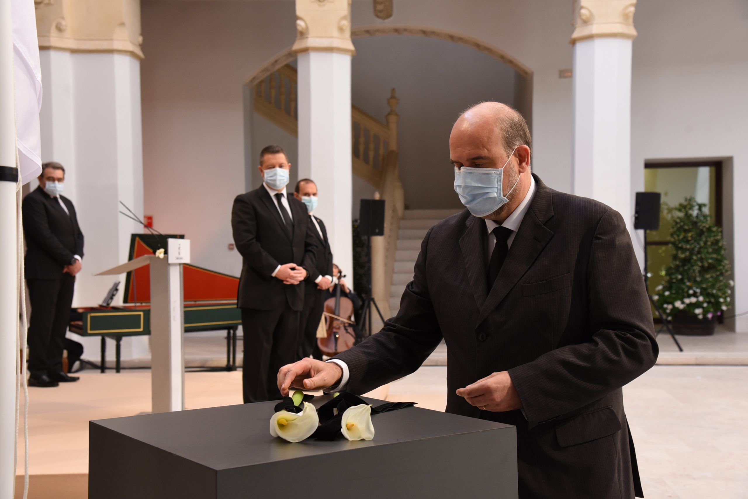 Ellas y ellos han sido los encargados de depositar una cala blanca, envuelta en un lazo negro, en representación de los sectores más significativos que han trabajado sin descanso en la lucha contra esta pandemia. A su trabajo, agradecido y reconocido, el presidente ha querido sumar el de los farmacéuticos, de los servicios funerarios, funcionarios, conductores oficiales, empresarios, medios de comunicación, el de la Iglesia Católica, las diputaciones y los ayuntamientos.