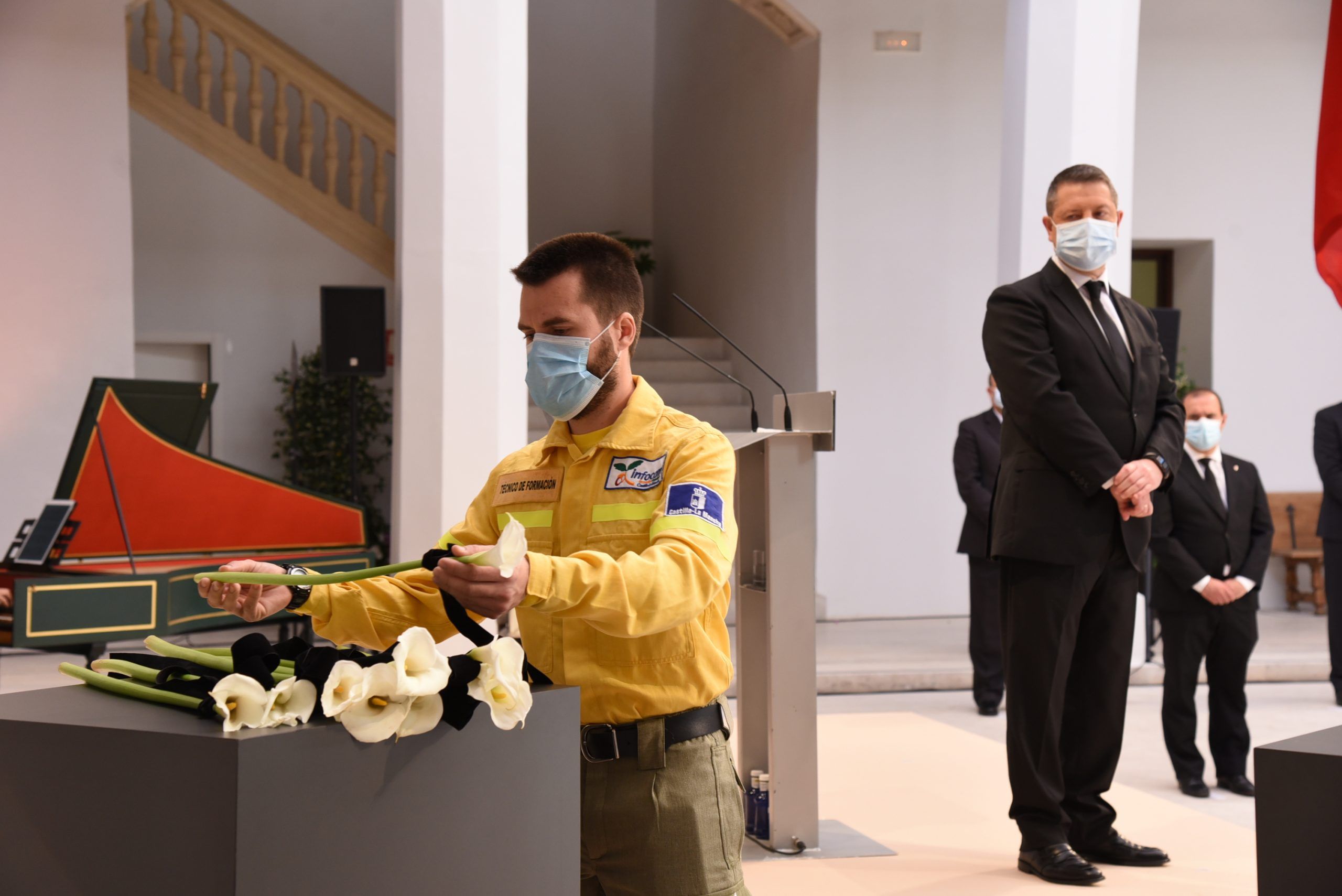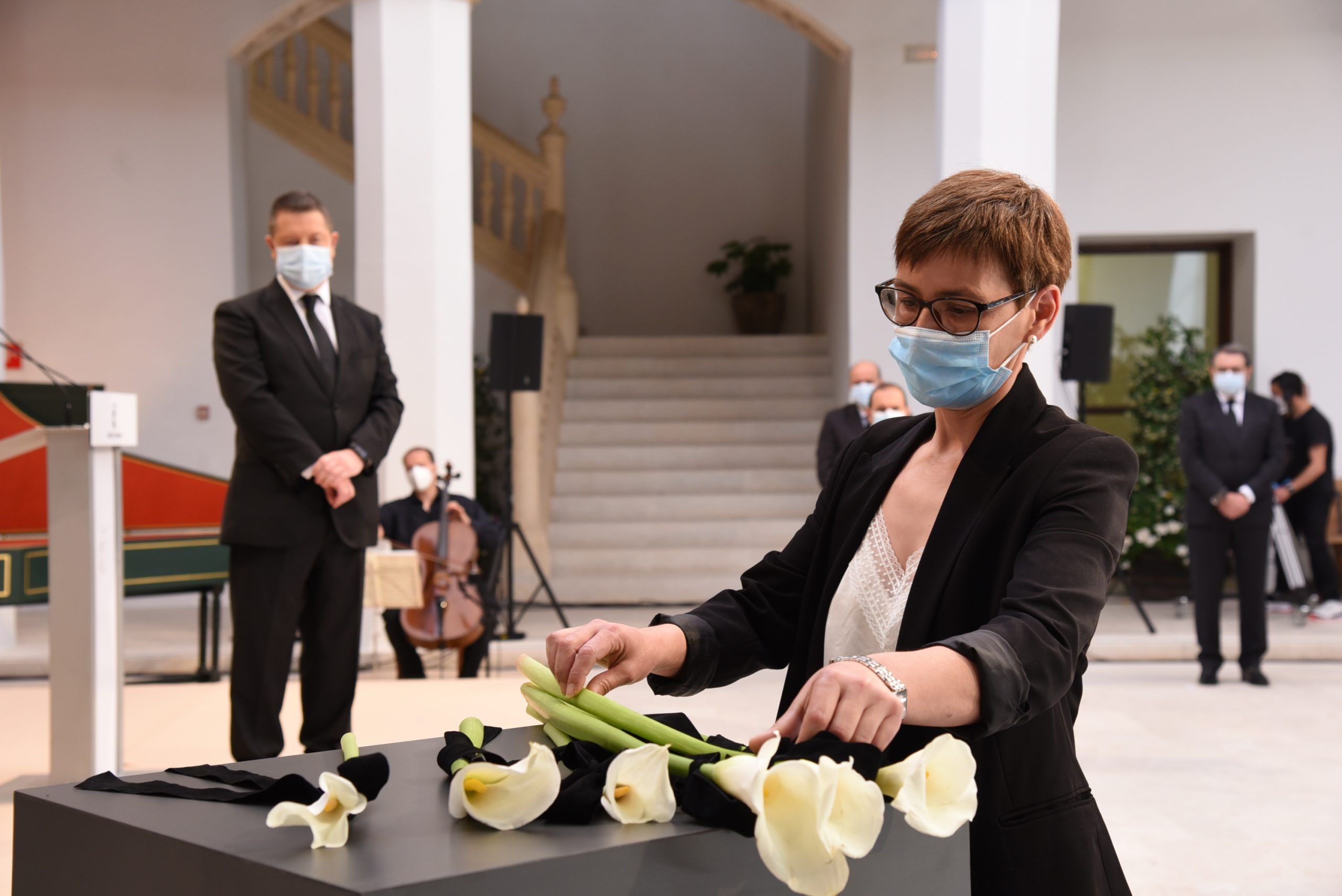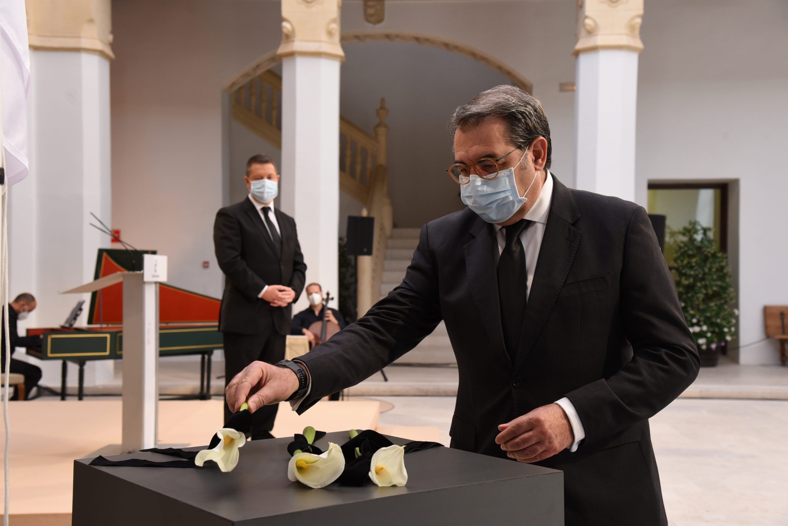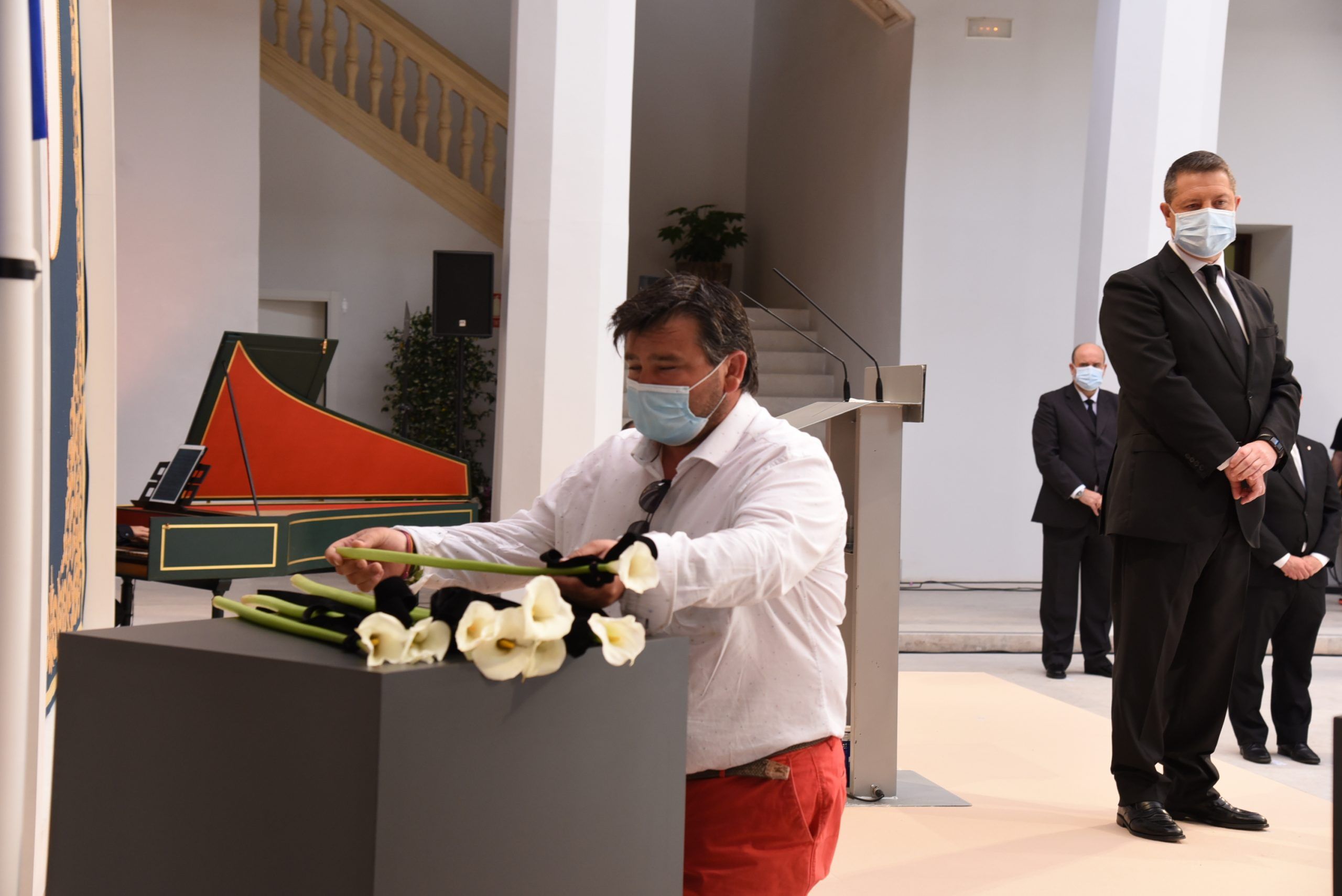 Ellas y ellos han sido los encargados de depositar una cala blanca, envuelta en un lazo negro, en representación de los sectores más significativos que han trabajado sin descanso en la lucha contra esta pandemia. A su trabajo, agradecido y reconocido, el presidente ha querido sumar el de los farmacéuticos, de los servicios funerarios, funcionarios, conductores oficiales, empresarios, medios de comunicación, el de la Iglesia Católica, las diputaciones y los ayuntamientos.