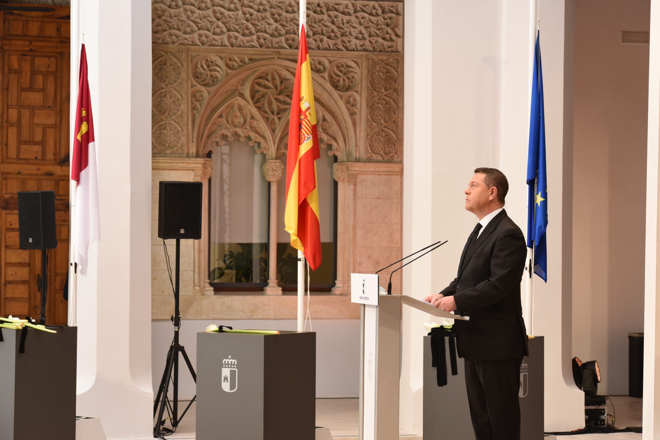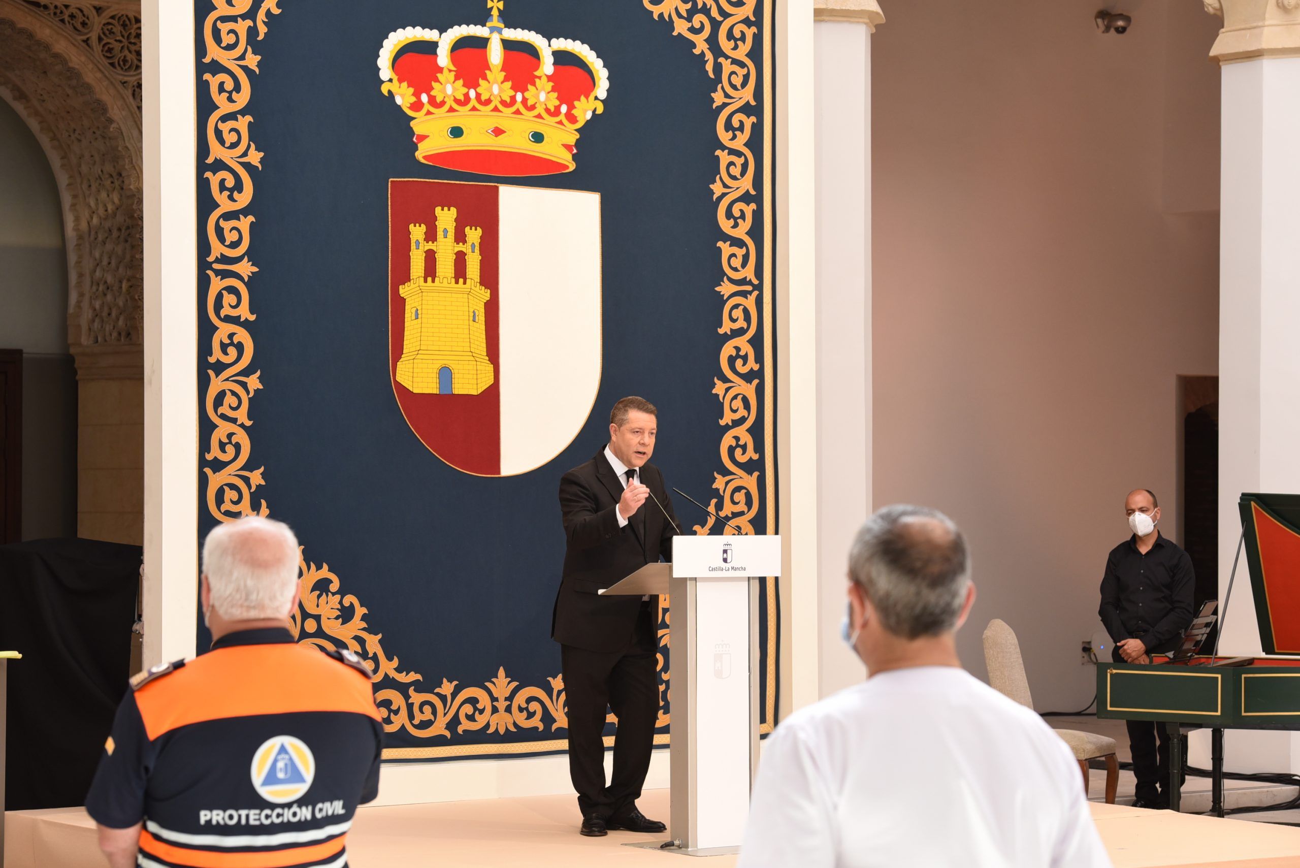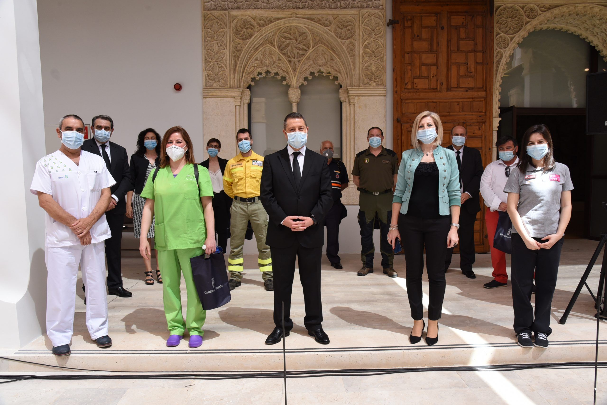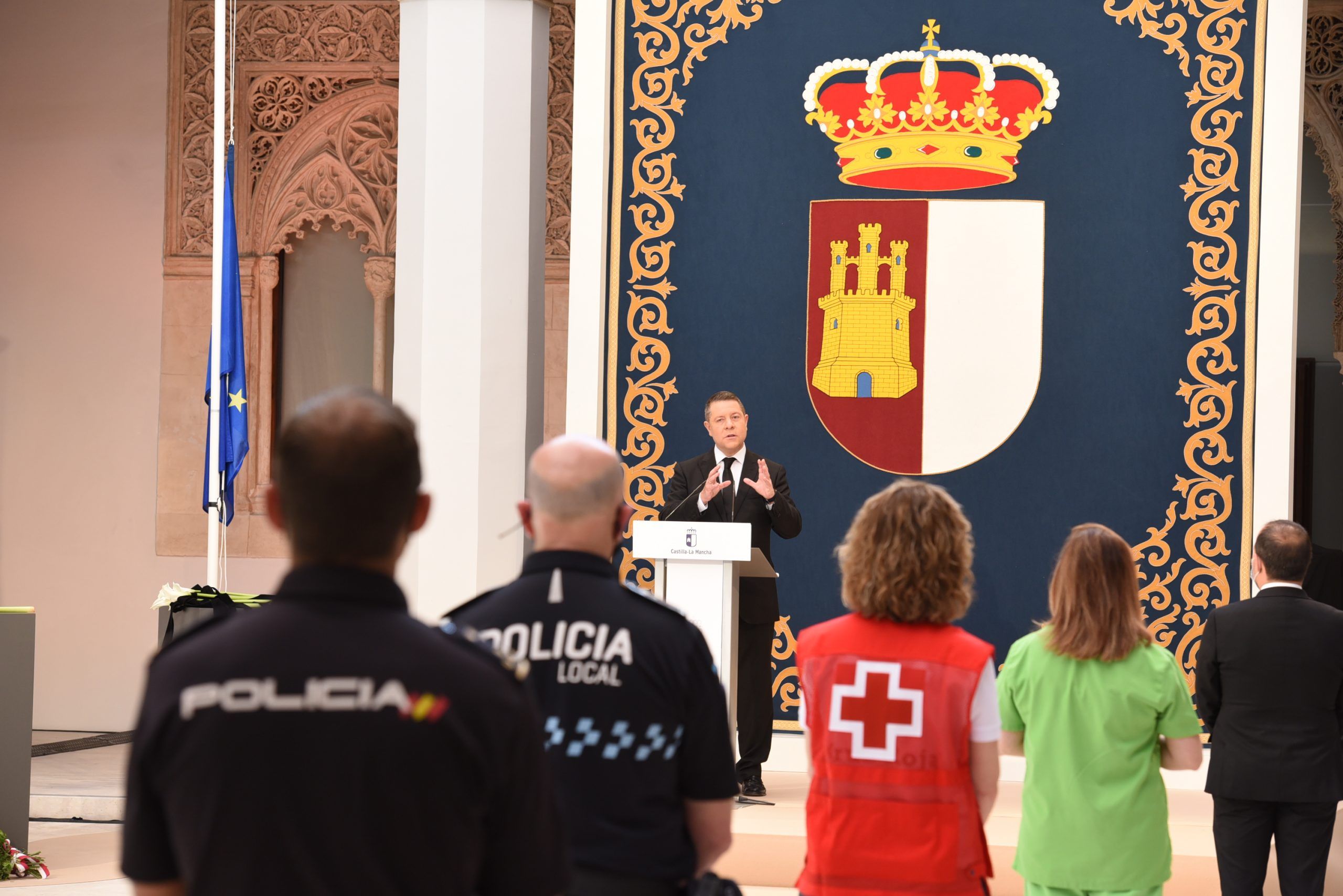 Lejos de hacer de la jornada de hoy una fiesta, Emiliano García-Page sí que ha querido exhibir el orgullo que siente y respira Castilla-La Mancha por los hombres y mujeres que, día a día, han trabajado por mantener el pulso de esta tierra que ha sufrido en primera línea la onda expansiva del virus. Del mismo modo, ha querido centrar la jornada en expresar y compartir el dolor de las cerca de 3.000 familias que lloran la pérdida de sus seres queridos, a los que ni si quiera pudieron despedir.